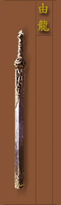 “由龙”剑,金铜,有点红红的颜色。剑头可能是软的,会抖动。护手是球形,可以任意调换剑的方向,因此非常灵活。宝剑太锋利有力了,因此它打断别人的剑时,产生很大的震荡,由护手内的小球旋转化掉。“由龙”剑会发声,而且打得快时,声随剑走,声音就是环绕立体声的效果了。