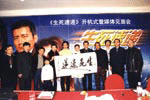2001年11月28日下午,国产新片《生死速递》隆重开机。北京亮河马大厦宴会厅非常热闹,近百家媒体记者把这里堵了一个水泄不通--柯受良、任贤齐、林心如、江珊等众主演在这里举行开机仪式。这部电影取材发生在台北与杭州之间捐献骨髓的真人真事,由河北电影制片厂、北京今古影视策划公司、广州东影影视公司和九州音像出版公司联合摄制的,耗资1500万元,是近年来内地民营影视机构对国产电影少见的大投资。在仪式现场著名 书法家米南阳先生上台挥毫泼墨,一气呵成写就了《生死速递》片名,以气势上让人感到了那种惊心动魄的速度感,主创人员在这幅书法作品前站定,为媒体记者们留下了难得的资料。随后,主创人员在背后的背景板上纪念签名。整个新闻发布会也象米南阳的书法一样,跌宕起伏,一气呵成。